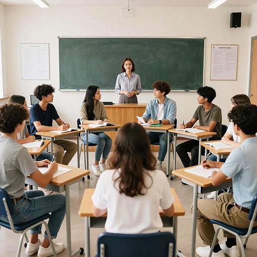 Photograph of a classroom with 16 students. Front row: Asian woman with black hair, smiling, wearing checkered shirt; curly-haired boy, head down; blonde woman in blue dress, serious expression. Background: diverse students, some smiling, others focused. Chalkboard in the back. Students seated at desks, some leaning forward. Classroom lighting is bright.