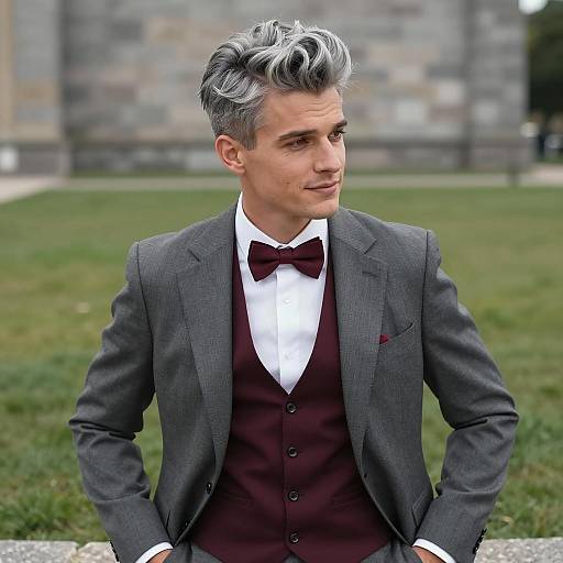 Man with hairstyle buzz cut with shaved designs, defined jawline, and smooth skin, wearing a classic three-piece suit with modern cuts. Captured in a professional studio setting with soft diffused lighting and a neutral backdrop, realistic portrait photography style.