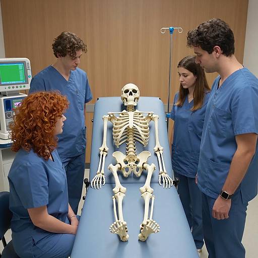 two male surgeons in green scrubs and masks, performing a surgical procedure on a male patient with his head wrapped in bandages. One surgeon holds a drill, focused on the patient's skull. The patient is seated, wearing a green surgical drape. The background shows medical equipment and monitors.