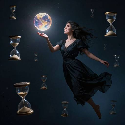 A spectral wraith with hourglass-fingered hands leaking fine, luminous sand reaching forward, its form dissolving into trails of drifting time-sand and fractured clock-plates, moving through a liminal dusk scattered with floating clock-hands and distant tolling.
