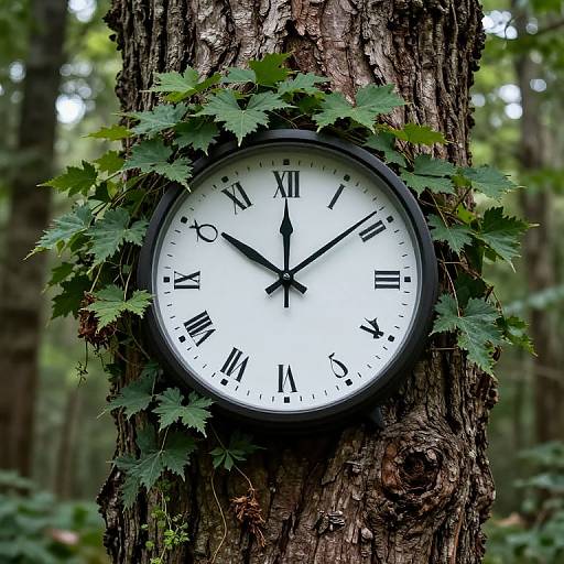 Time and nature intertwine in a haunting embrace, as a clock tower sprouts from the earth like a gnarled tree, its silent ticking echoing forgotten echoes while the barren branches whisper secrets of eternity amidst a still, mournful landscape.