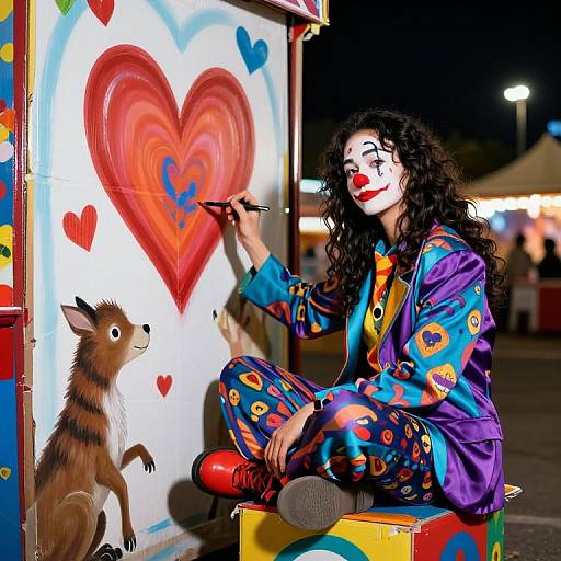 A woman with silver hair showcasing exaggerated clown face for Instagram, featuring intricate designs covering the full body in bright colors. This piece embodies elements of playful horror aesthetics reminiscent of a chilling film poster. --ar 4:5 --v 6.0 --s 750