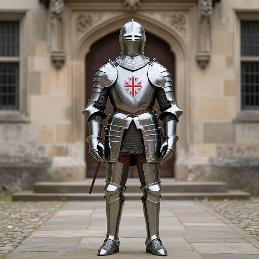 renaissance faire knight, photograph of a middle-aged man, European, standing outdoors, wearing medieval knight armor, silver helmet, yellow surcoat over maroon tunic, shoulder pauldrons, belt with dark brown leather, dark brown background, arched window behind him, mustache, serious expression, daylight, realistic style, historical costume, detailed ures, realistic lighting, medieval knight appearance