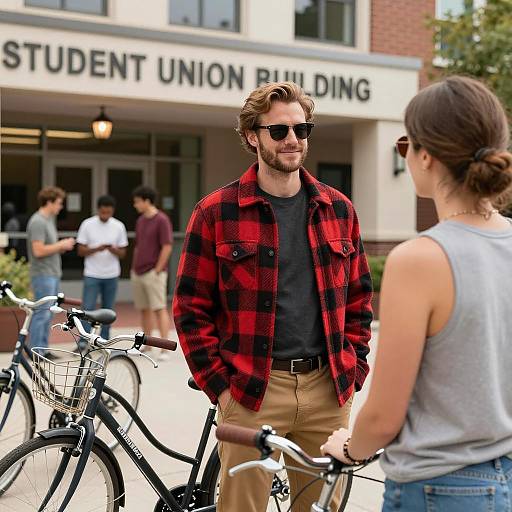 upper body, 2boys, couple, face-to-face, smile, eye contact, looking at another, outdoors, police, police uniform, mature muscular male with a charming sandy brown mullet, amber eyes, wearing a red shirt, dark charcoal pants, police hat, collared shirt, belt, mature muscular male with deep chestnut thick hair, short hair, light blue eyes, wearing a black shirt, medium gray pants, collared shirt, belt, beard, yaoi, detailed clothes description, bara, large pectorals, pectoral press, sideburns, anatomy
