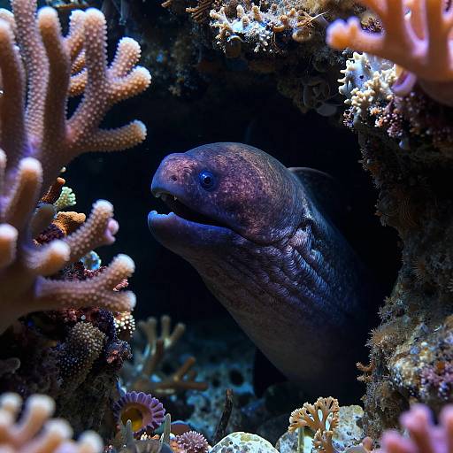 a vibrant coral reef, placed in the center of the image. The black background fades into darkness at the borders. Rendered as a realistic anamorphic artwork, it combines muted color palettes with graffiti-inspired illustration. Close-up composition emphasizes intricate details and textural design.
