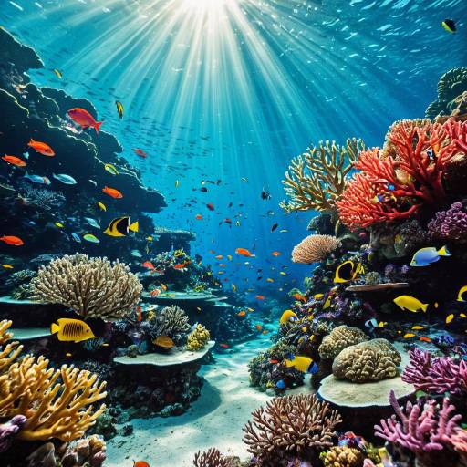 Fantasy landscape of an underwater city in a coral reef, with bioluminescent creatures, colorful corals, and an aerial view of the vibrant city.