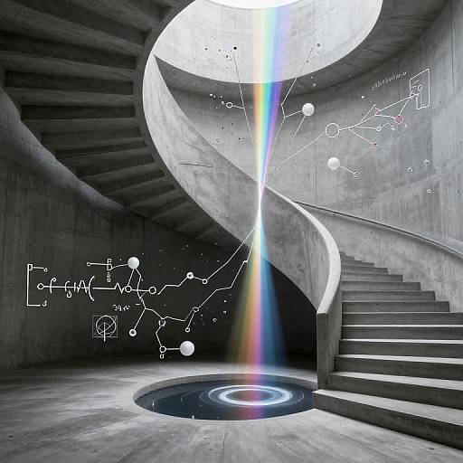 Spiraling staircase ascends through a vibrant cosmic backdrop, its steps transitioning from deep blues to fiery oranges and purples, converging toward a radiant sunburst that illuminates the abstract, dreamlike scene.