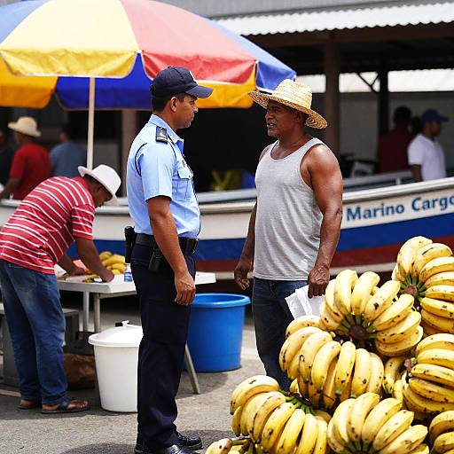 Two male police officers in dark uniforms and caps examine a beige briefcase on a wooden table. One officer holds a small gun, the other handles a white cloth. Three hanging lamps above. Teal walls, green door, beige chair in background. Cash and documents scattered on table. Old-fashioned green typewriter on left.