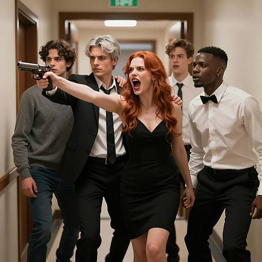 Four young men in a warehouse with stacked boxes. Left man in zipped jacket talks, right man in hooded sweatshirt smirks. Center man in tracksuit talks on phone, middle-right man in t-shirt listens. All stand close. Boxes labeled "Packaging" and "Crawford." Right man's arm extended towards middle-right man. All men have short hair. Background includes a dartboard.