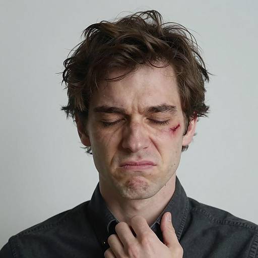 portrait, 1boy, muscular Caucasian man with a bushy mustache and crew-cut hairstyle, facial hair, lipstick, teeth, makeup, brown eyes, smile, looking at viewer, gray background
