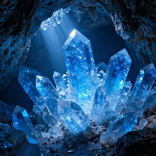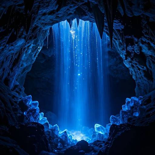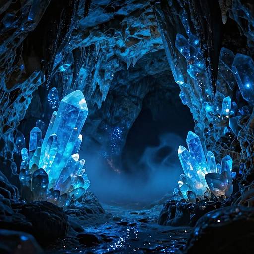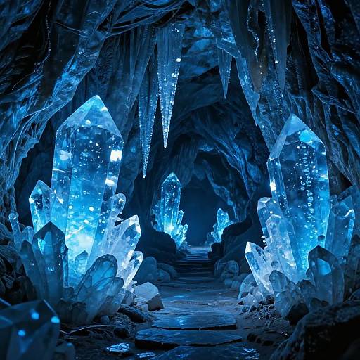 Fantasy scene featuring a luminous crystal cave with glowing stalactites, magical atmosphere, highly detailed.