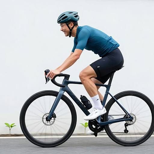 Photo-shoot, focused spin cyclist, deep side part, muscular and lean, 80s exercise outfit, neon crop top and fitted bike pants, sharp editorial fashion shoot, matte midnight blue studio background