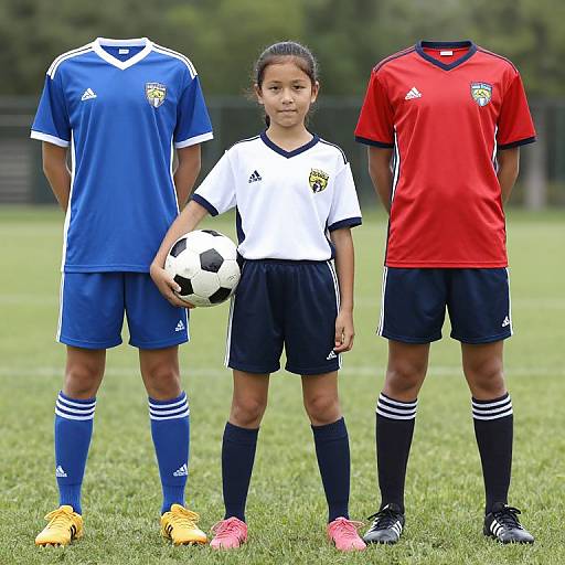 woman with pretty face and pretty hair. smiling Woman, sporty, royal blue soccer jersey with white trim at the collar, short sleeves, vertical striped pattern on one side, black athletic leggings, photo studio background --sref 1467