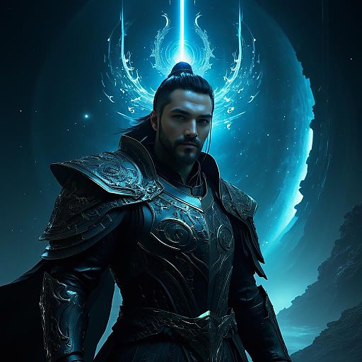 Beautiful dark fantasy scene featuring an ancient castle with crumbling towers and a swirling mist at the top from which a fierce warrior emerges. High fantasy, highly detailed and visually striking