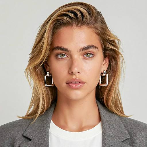 short gray afro,1girl, solo, jewelry, earrings, necklace, curly hair, realistic, looking at viewer, afro, upper body, lips, grey background, dark-skinned female, dark skin, grey eyes, grey shirt, grey hair
