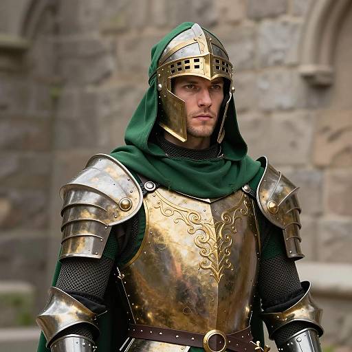 Illustration of enchanted armor, styled in a medieval fantasy setting. The armor features intricate detailing, magical illumination, and an ethereal glow, with backgrounds of deep emerald greens. The design conveys fantastical elegance and whimsical ambiance in ultra-detailed 4K resolution.
