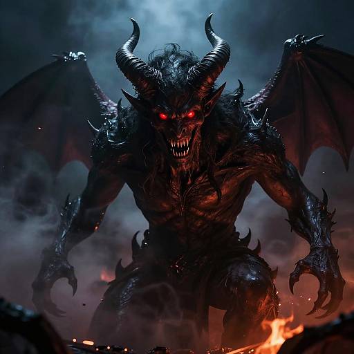Frightening close-up of a Daemon Prince, with a swirling black mist surrounding its form, standing in a void between worlds, wielding a dimensional blade.
