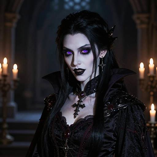 realistic style, gothic fashion, female, long hair, black hair, bangs, dark makeup, choker necklace, cross pendant, sharp eyes, dark lipstick, pale skin, abandoned cathedral interior, black lace peplum top, ominous dread, slow dimming light from broken windows
