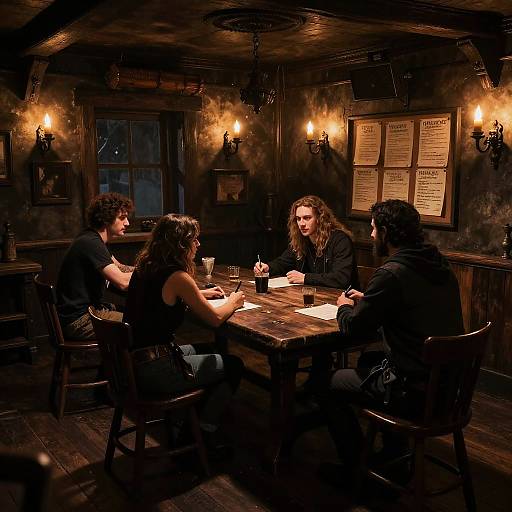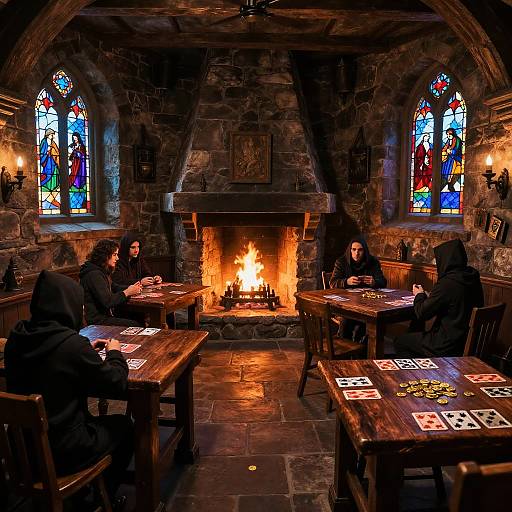 dnd large tavern map vibrant medieval inn, spacious wooden hall with stone walls, bustling crowd of adventurers, treasure chests, ornate chandeliers, detailed bar with ale taps, rich color palette with warm tones and shadows, intricate layout for immersive gameplay