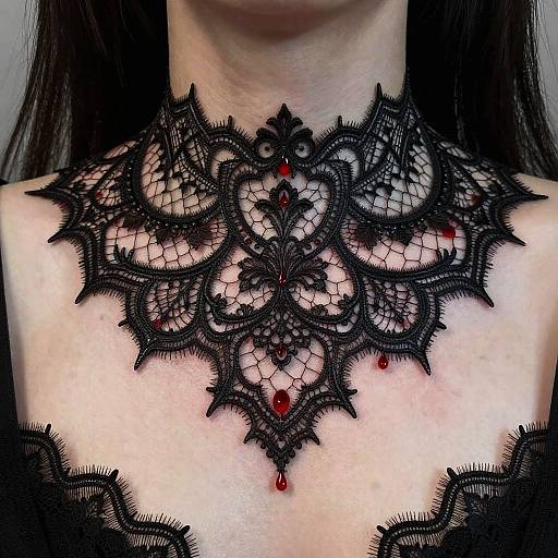 Woman with breastplate, female chest tattoos. Intricate details. realistic lace mesh pattern across chest