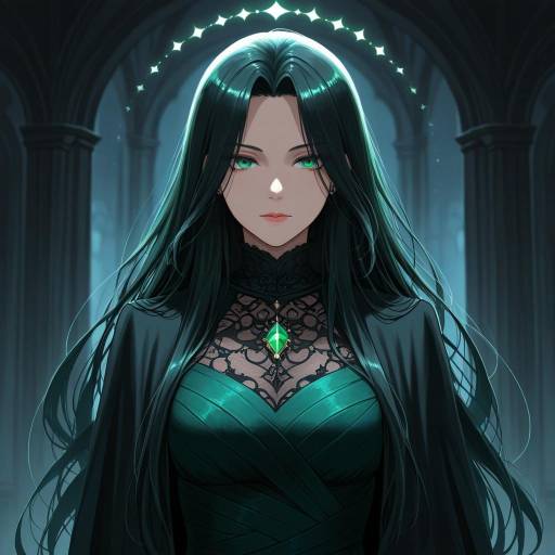 Mysterious mage in a futuristic cloak with an ancient book in hand, glowing eyes, emerald light