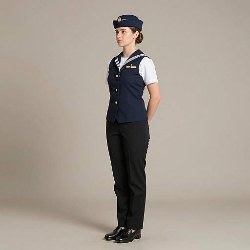 woman navy fancy dress,1girl, solo, ship, watercraft, brown hair, pants, long hair, military, realistic, blue pants, uniform, brown eyes, standing, looking at viewer