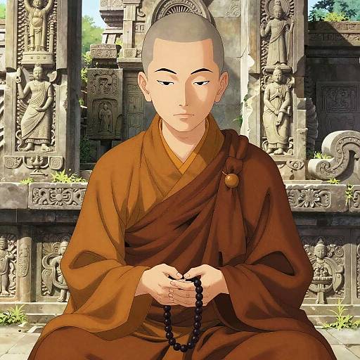 a wise monk, holding a glowing map, dressed in simple monk robes with prayer beads, exploring a peaceful mountain temple amidst clouds, depicted in the imaginative and highly detailed anime style of Eiichiro Oda.