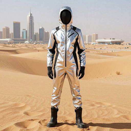 a rugged man wearing desert adventure gear including a cloth head wrap, dark goggles, leather harness and belt with pouches, tactical gloves, and sturdy boots standing in a desert landscape with blurred mountains and dry shrubs in the background, realistic and gritty style, muted earthy tones with dominant brown, tan, and dark blue colors
