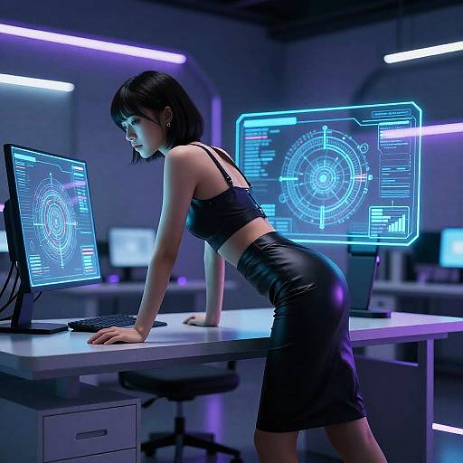 anime girl with short teal hair, wearing a stylish dress and heels, seated casually at her office desk, captured in a natural window light, featuring rooftop garden office and serene concentration atmosphere