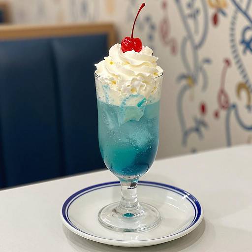 Two tall glass desserts with gradient colors, orange to pink on the left, blue to white on the right, topped with ice cream and a black straw. Small clear glasses with green and orange liquid are in front. Background is a blurred café interior.