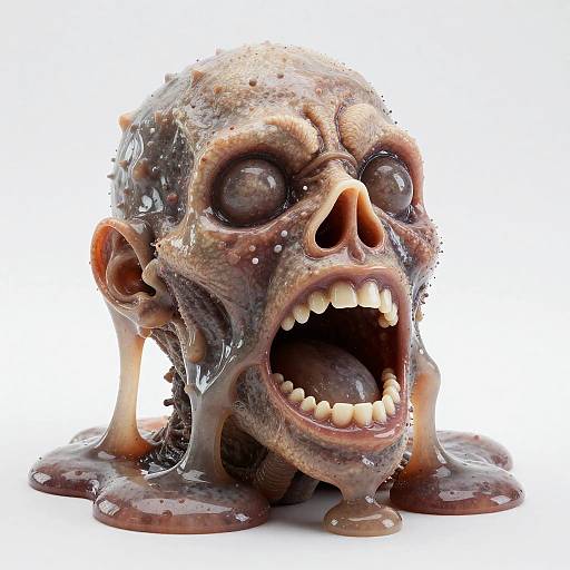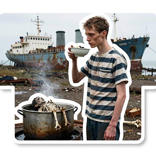 Photograph of a distressed woman with bloody face, wide eyes, and teeth bared. She has disheveled blonde hair, wearing a white shirt. Background is a ured wooden wall. She is hunched over with hands near her head.