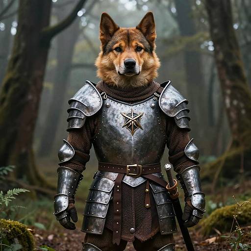 dog with pointy ears and long nose standing alert in a sunlit forest clearing, detailed fur texture, soft background, photorealistic style