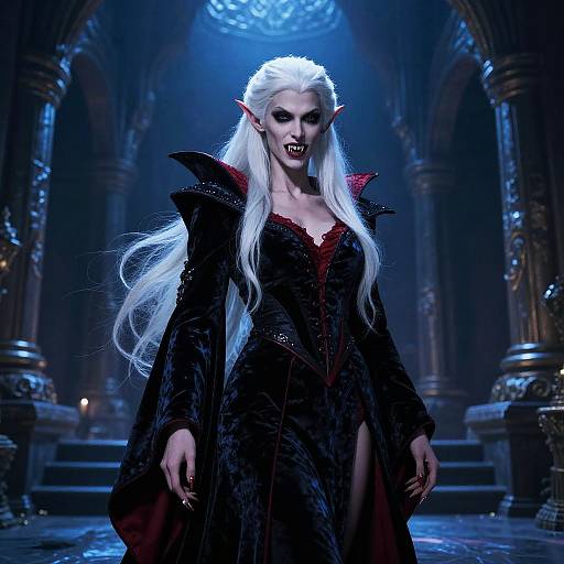 female dark elf drow, dark [blue|grey] skin tone with white hair top ponytail. wearing beautiful elegant blue and purple dress, wealth oppulent gothic elaborate magnificent (zrpgstyle) (masterpiece:1.2)(best quality:1.2) (detailed) (intricate) (8k) (HDR) (cinematic lighting) (sharp focus)