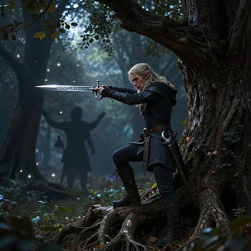 A elven warrior with sleek features possessing flowing silver hair and captivating emerald eyes. Dressed in an exquisite decorated leather armor, she stands in a magical enchanted forest, embodying the essence of a fantasy tale.