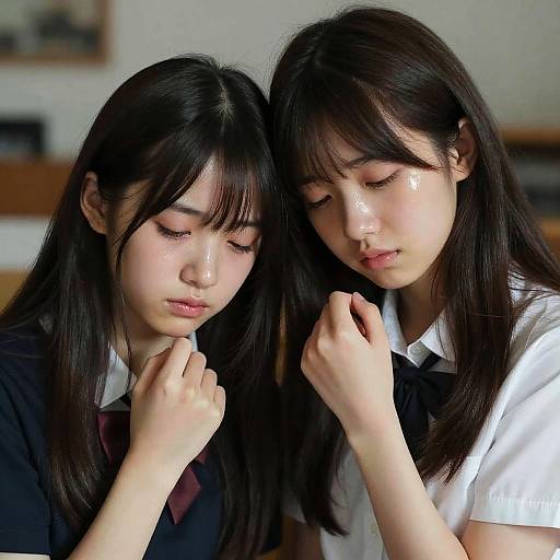 Photograph of a woman with long, dark, wavy hair, wearing a pink tank top, hugging a man in a blue shirt from behind. She is crying, eyes closed, head resting on his shoulder. His face is not visible. Blurred urban background with people walking. Sunlight casts soft shadows. Woman's arms wrapped around man's torso, man's arms around her waist. Emotional embrace.