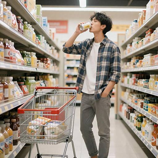Blonde woman with backless black dress and high-waisted black skirt stands in grocery store, holding apple above head. She has slim build, small to medium breasts, and visible back muscles. Shelves filled with bananas, apples, oranges, grapes, and bottles are in background. Clear plastic containers stacked on top of her head. Bright lighting, produce in front, shelf with black bottles in background. Her hair is in a loose ponytail. One purple fruit in bottom left.