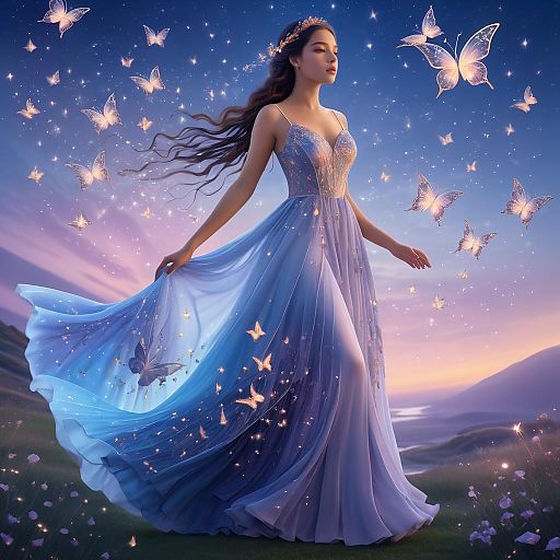 Art by Mothmeister, a serene woman surrounded by glowing butterflies, Do the wings carry tales untold?, ethereal peaceful, delicate lighting.