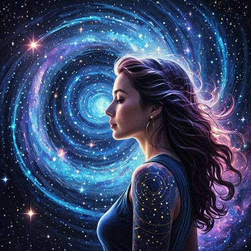 female human silhouette in a fluid form surrounded by a large glowing aura in cerulean tone. The image features ethereal light trails and cosmic dust, captured in high detail with cinematic lighting.