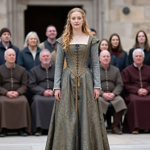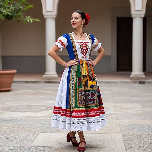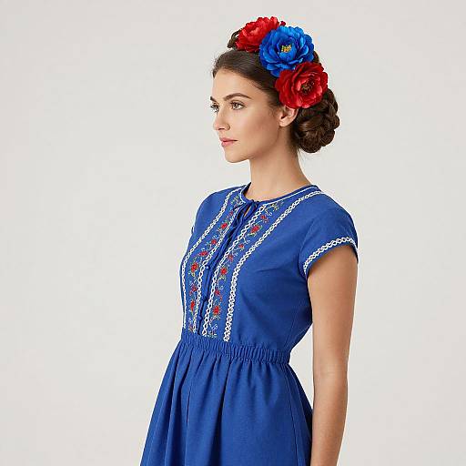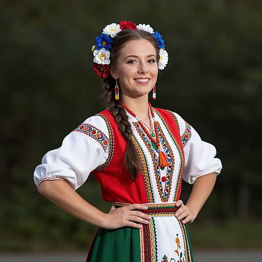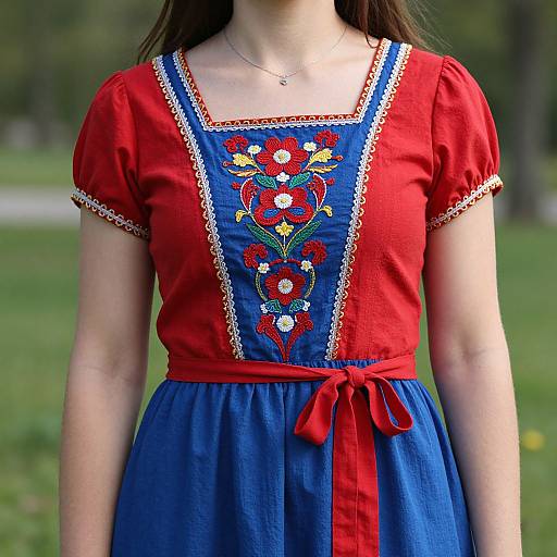 national costume european,1girl, solo, jewelry, necklace, long hair, flower, dress, earrings, realistic, blurry background, outdoors, tree, blurry, hair ornament, hair flower, looking at viewer, black hair, head wreath, short sleeves, brown eyes, brown hair
