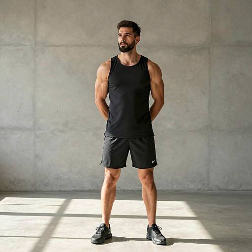 full body, 1girl, solo, muscular man with short brown hair wearing camping gear, yoga pants, sports bra, fit physique, sleek silhouette, dynamic pose, body in motion, detailed fabric texture, form-fitting clothes, lifting a heavy object, grey background
