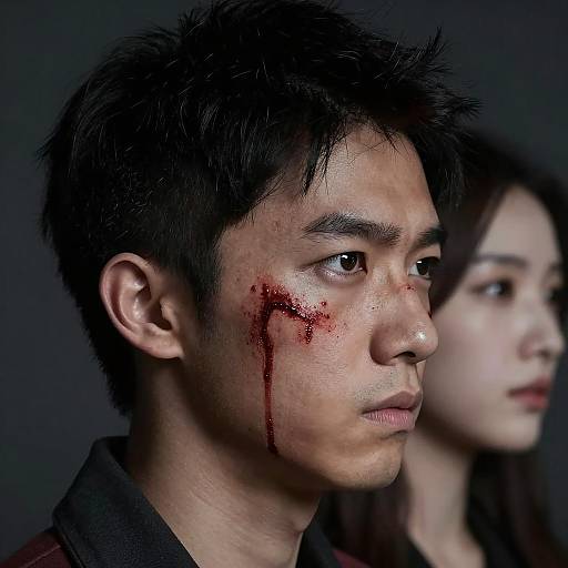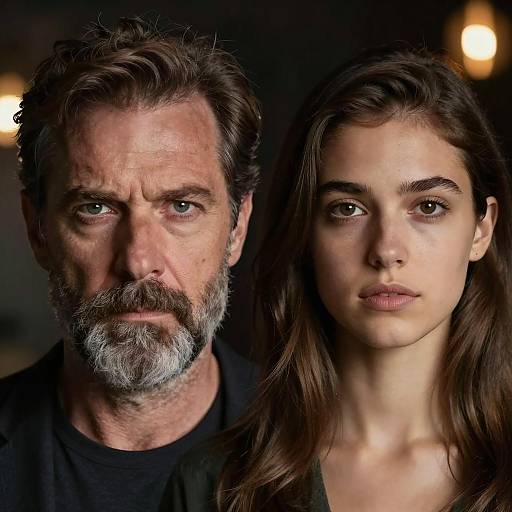 a woman with shoulder-length black hair, pale skin, and a serious expression in the foreground. Two men in white t-shirts and shorts stand in the background, one with a beard and the other with short hair. The room has a grid-like pattern of shadows on the ceiling and walls. The men are blurred, with the woman in sharp focus.