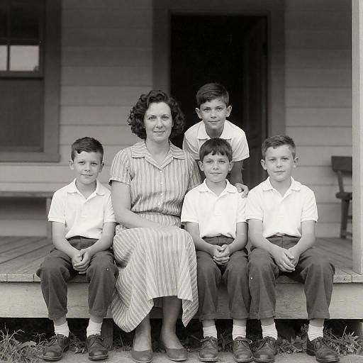 Photograph of a family outside a white porch. Five people: two adults, three children. Adults smiling, children standing in front. Female adult in red sweater, male adult in blue shirt, girl in pink hoodie, boy in gray sweater, red-haired boy in gray shirt. White porch, greenery, flowers in background. Casual clothing, relaxed poses, smiling expressions.