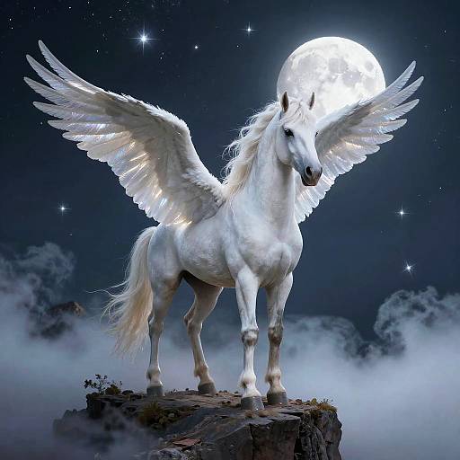 A hyper-realistic depiction of a hind Pegasus, with stellar wings sparking with cosmic dust, luminous hooves, strong muscular legs, emerging from moonlit mist with a noir palette of silvery blues and deep midnight black, detailed and atmospheric, walking toward the viewer
