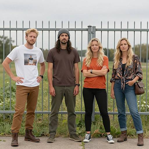 Woman with long wavy blonde hair, off-shoulder white crop top, and white skirt with a long side slit, sitting on a wooden fence at sunset. She leans back, head tilted up, eyes closed. Wooden fence posts in background, grassy field, clear sky. Sunlight casts a warm glow on her skin. Her right leg is bent, left leg extended. Wrist bracelet on her left wrist.