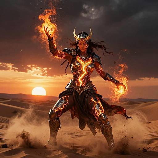 Fire painting of a dancing fire spirit set against a sandy desert, with glowing embers and dynamic flames in high resolution.