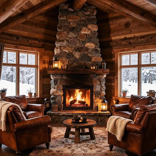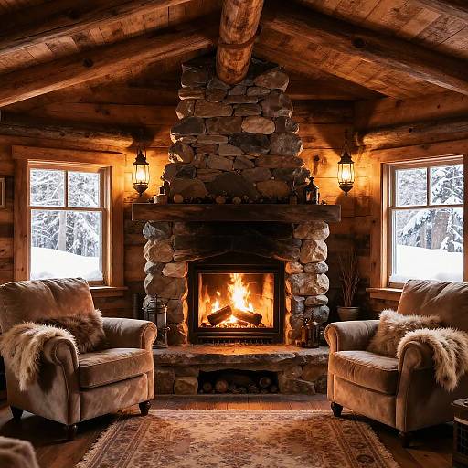 a cozy cabin interior where warm light spills from a fireplace; the temperature inside rises as the light flickers, simulating the changing seasons