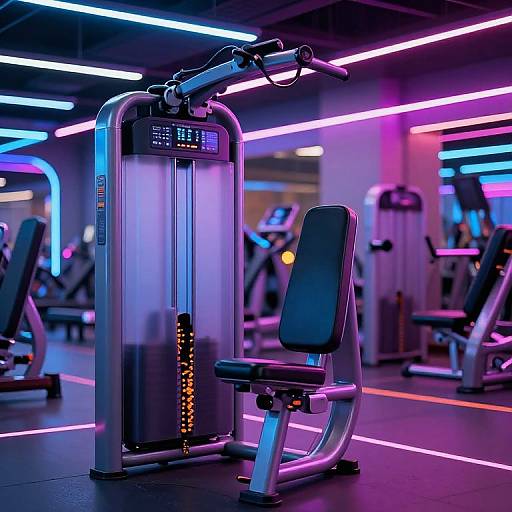 A futuristic wearable fitness tracker on a person's forearm, featuring a holographic display and biometric sensors, set in a high-tech gym with advanced workout equipment.