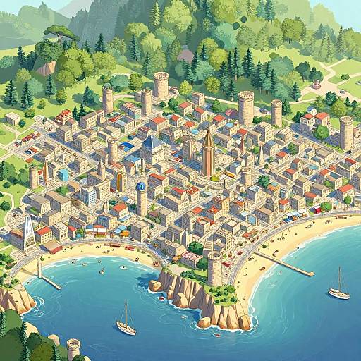 Live a city in the Viking Age, a bustling hub of exploration, trade, and craftsmanship, filled with longhouses, busy docks, and finely crafted weapons. The city is surrounded by rugged coastlines and lush forests, with fjords cutting through the landscape. The architecture is a mix of Norse and local influences, with timber structures and cozy thatched roofs. Fantasy.