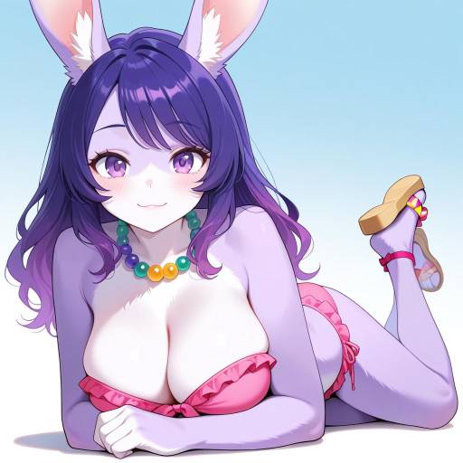 full body, 1girl, solo, lying on stomach, a young woman with flowing long brown hair and wolf ears, animal ears, animal nose, snout, furry, dark brown fur, pink bikini, strapless bikini, bare shoulders, cleavage, twinkling blue eyes, happy, smile, looking at viewer, silver leaf pendant, glitter sleeping slippers coupled with sky fleece, gradient background