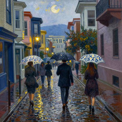 rainy city street during dusk, wet pavement reflecting neon signs, glowing reflections with moody ambiance, evocative painting
